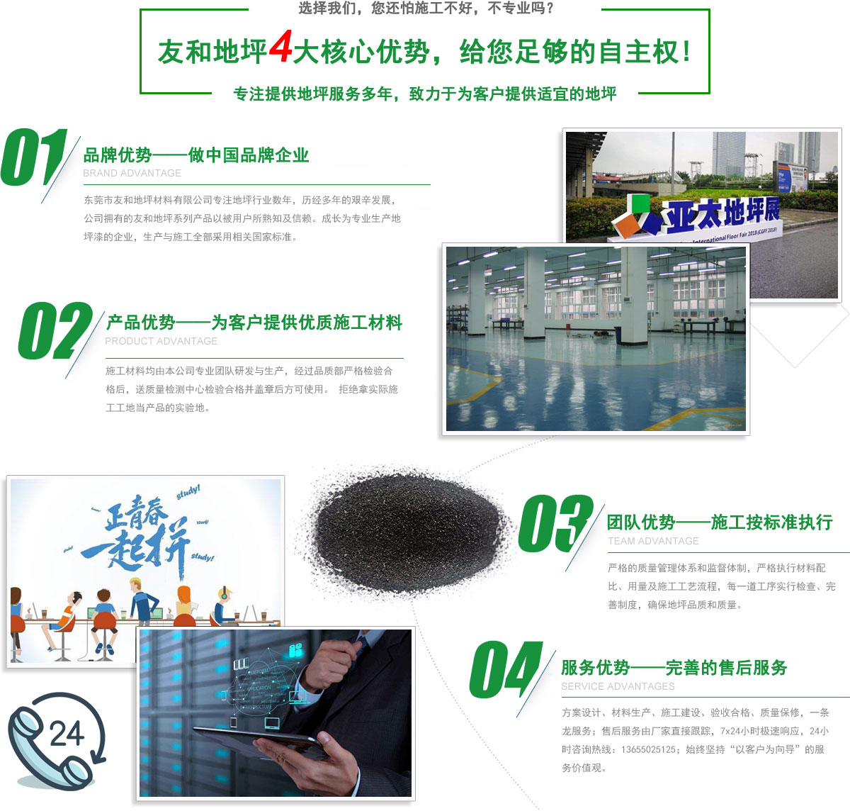 东莞市友和地坪材料有限公司是一家致力于研发、设计、施工的地坪企业,公司自成立以来,凭借精湛专业技术,优良的施工品质,完善周到的售后服务,承接了全国各地的地面改造工程,工程质量受到了广大客户的好评。 公司主要从事环氧平涂地坪、环氧砂浆地坪、环氧自流平地坪、环氧防静电地坪、水性环氧地坪、金刚砂耐磨地坪、混凝土密封固化剂地坪、混凝土密封固化剂染色地坪、水泥自流平地坪、艺术压花地坪、艺术透水地坪、丙烯酸球场、硅PU球场、PVC地板、塑胶跑道、停车场地坪、无震动止滑坡道等。 在电子、纺织、通讯、学校、印刷、化工、食品、制药、五金、生物、宾馆、电路板、电镀、家具、航天、码头、仓库、医院、喷油车间、地下停车场、加工厂及···